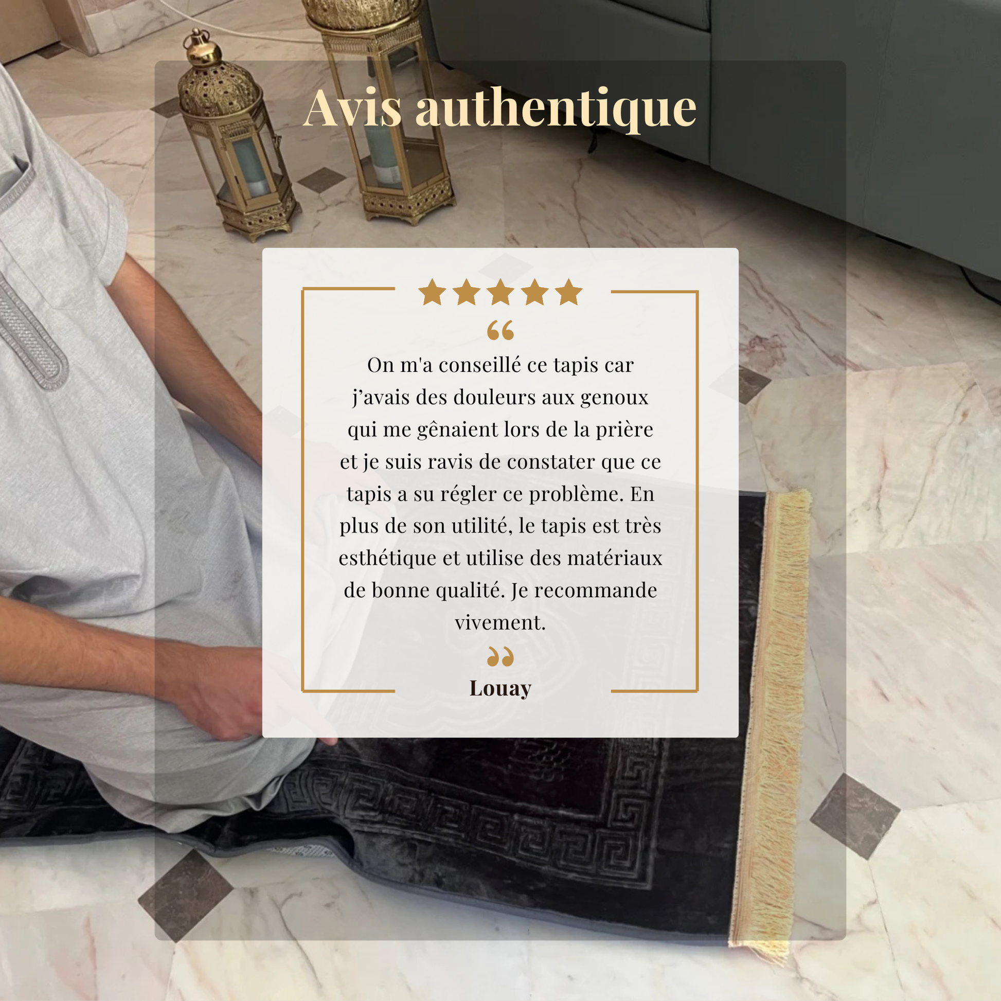Aujourd’hui, avec notre tapis de prière ergonomique, les genoux sont soutenus, les douleurs soulagées, et l’esprit libre de s’élever en toute sérénité.